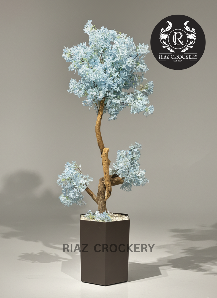 This is a beautiful artificial flower tree with soft, light blue flowers. It has a natural-looking, twisted brown trunk and branches covered in these lovely blossoms. The tree is set in a tall, dark brown square pot with a modern, simple design. It's a calming and elegant decoration that brings a touch of nature and soft color to any room, and it's completely worry-free as it needs no care.