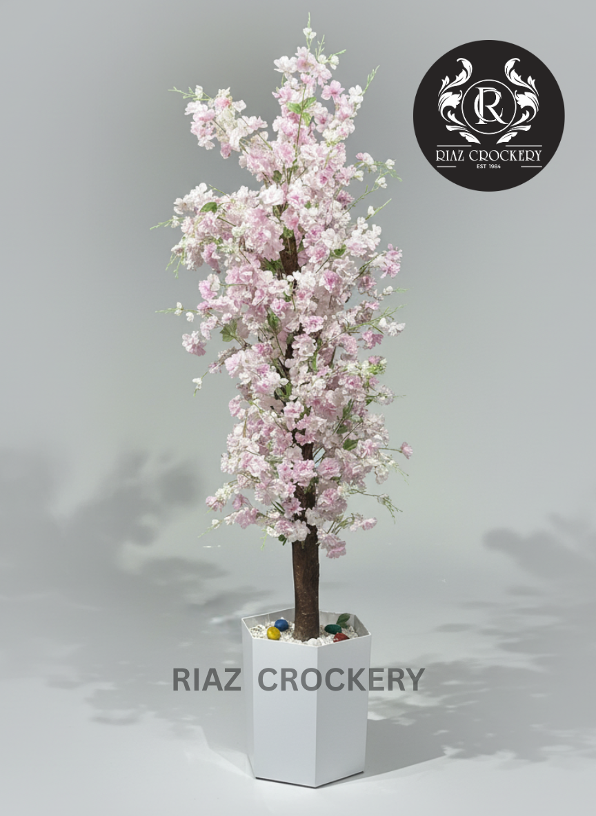 This is a beautiful artificial flower tree, standing about 5 to 6 feet tall. It has a single brown trunk covered in many delicate pink and white flowers, looking like a lovely cherry blossom tree. The tree is placed in a modern, white pot with a cool, angled design. It's a charming decoration that adds a soft, pretty splash of color to any room without needing any care.