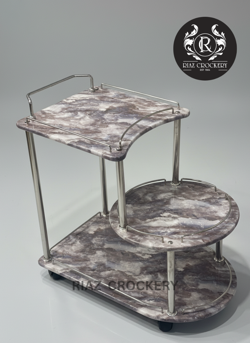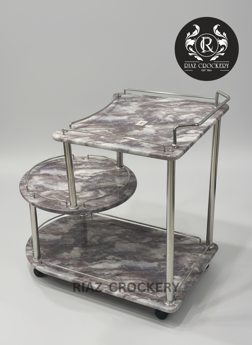 Serve in style with the fancy KC Tea Trolley. This unique trolley has three different levels, all with a beautiful marble look, and bright silver rails to keep things safe. It's perfect for carrying drinks, snacks, or even desserts, making serving guests a breeze and adding a touch of class to your home.