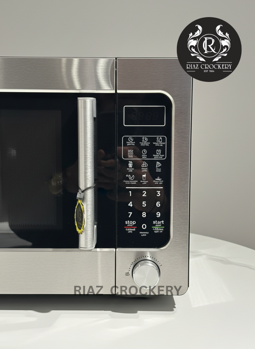 This is a large Kenwood microwave oven with an impressive 62-liter capacity, perfect for bigger families or extensive cooking needs. It features a sleek stainless steel exterior with a black control panel and a matching silver handle.