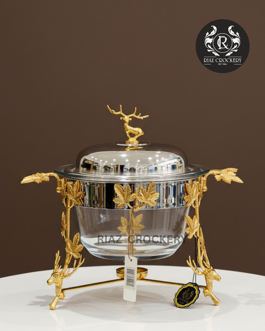It features a clear glass dish inside, topped with a shiny silver lid that has a fancy golden handle. The clear dish sits in an amazing silver-colored frame with detailed, open patterns. This whole frame is held up by rich golden legs, making it look very grand. Plus, there's a little golden dish underneath for a candle to keep your food warm.