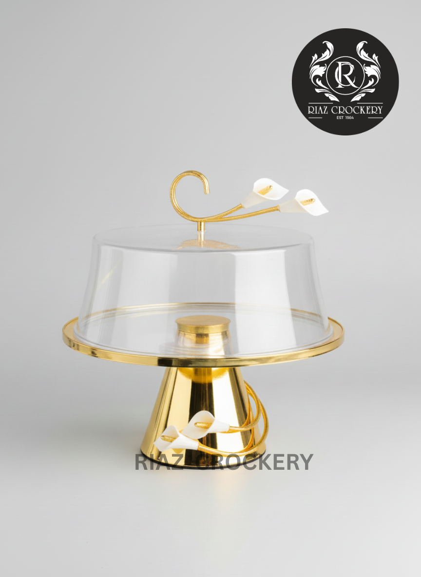 Present your confections in breathtaking style with our KIK Golden Cake Dish. This opulent cake stand features a brilliant golden pedestal base, elegantly sculpted and adorned with delicate white calla lily flower accents. The clear acrylic dome, topped with a charming golden scroll handle and matching calla lilies, beautifully showcases and protects your cakes, pastries, or treats. A perfect blend of luxury and functionality, it makes every dessert a centerpiece.