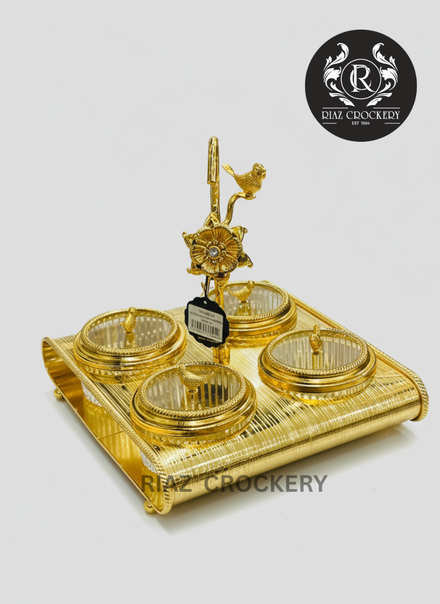 Add a touch of opulent charm to your serving with the KIK Golden Dry Fruit Tray. This exquisite set features four round, ribbed glass containers, each with a luxurious golden lid, perfect for showcasing an array of dry fruits, nuts, or candies. The containers sit securely on a rectangular golden tray, distinguished by its beautiful corrugated texture and gracefully curved ends. A decorative central handle, adorned with a golden flower and a charming bird, allows for elegant presentation and easy transport. This tray is a splendid fusion of functionality and lavish design.