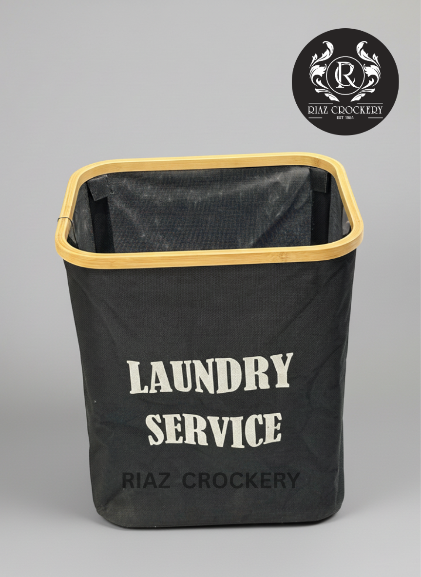 This is a simple and useful laundry basket, perfect for keeping your dirty clothes tidy. It's made from black fabric with a sturdy wooden (bamboo) rim at the top that helps it keep its shape. The basket has "LAUNDRY SERVICE" written on the front in white letters, giving it a cool, modern look. Inside, it has a black lining. This basket is great because it's lightweight and easy to carry, and it can fold flat when you're not using it, saving space.