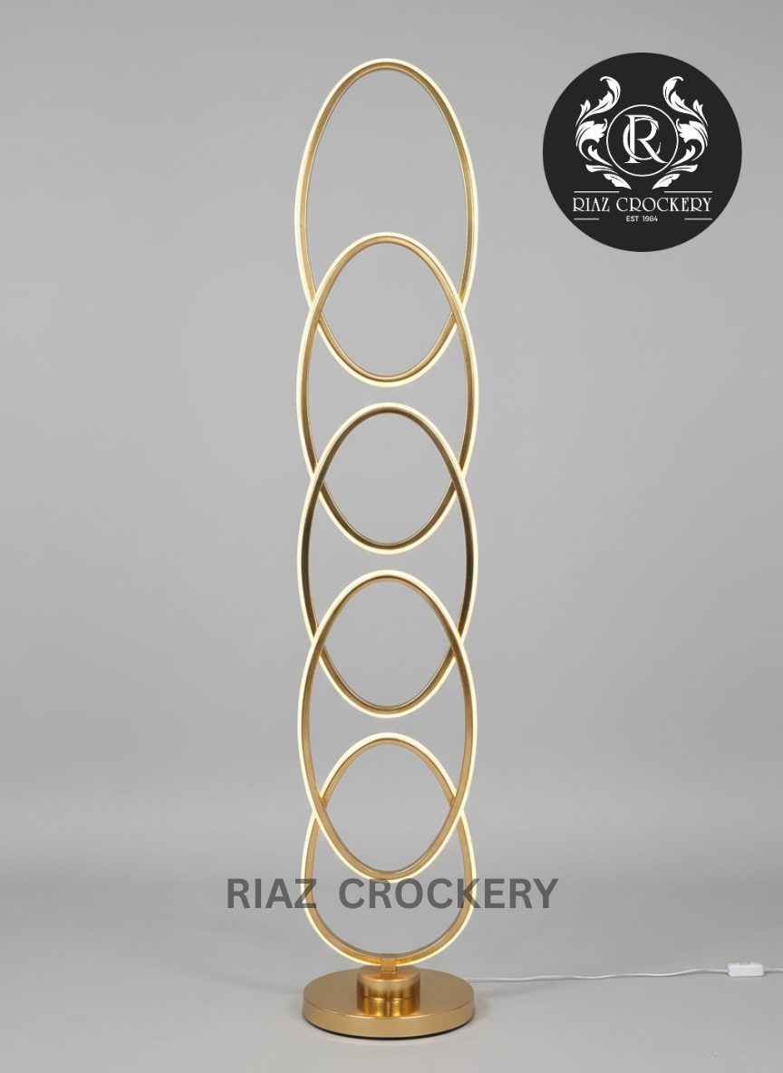 This tall, modern lamp is perfect for a corner. It has a clear tube body with a cool patterned design and a dark line running down the middle. Light shines from inside, creating a soft and stylish glow. It stands firmly on a shiny gold base.