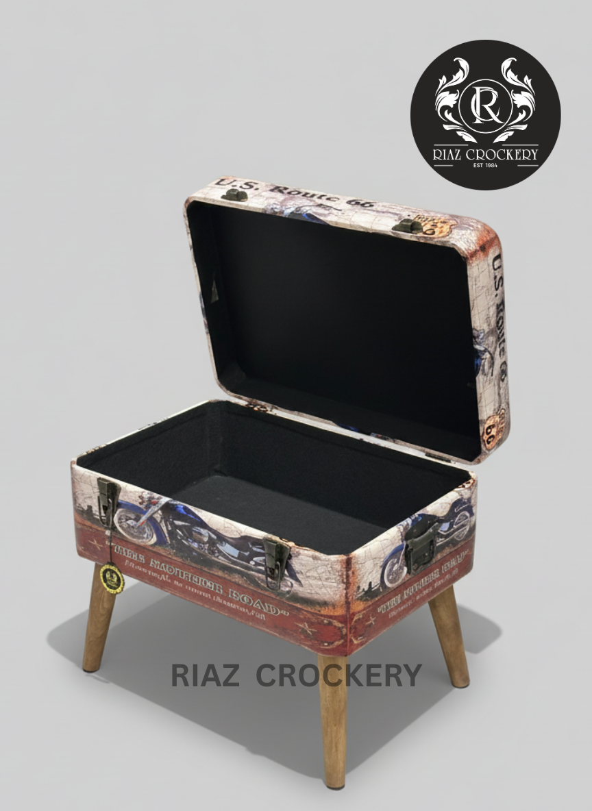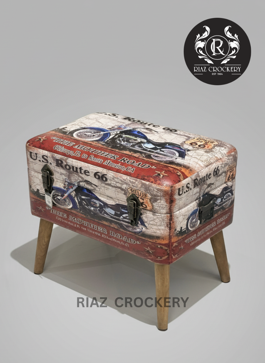 This is a cool Route 66 Storage Box, shaped like a vintage trunk with a fun, road-trip design! It has pictures of motorcycles and "U.S. Route 66" on it, giving it an adventurous look. The padded top opens up for hidden storage and also works as a comfy seat or footrest. It sits on sturdy wooden legs and has cool metal latches, adding a unique, travel-inspired touch and extra tidy space to any room.