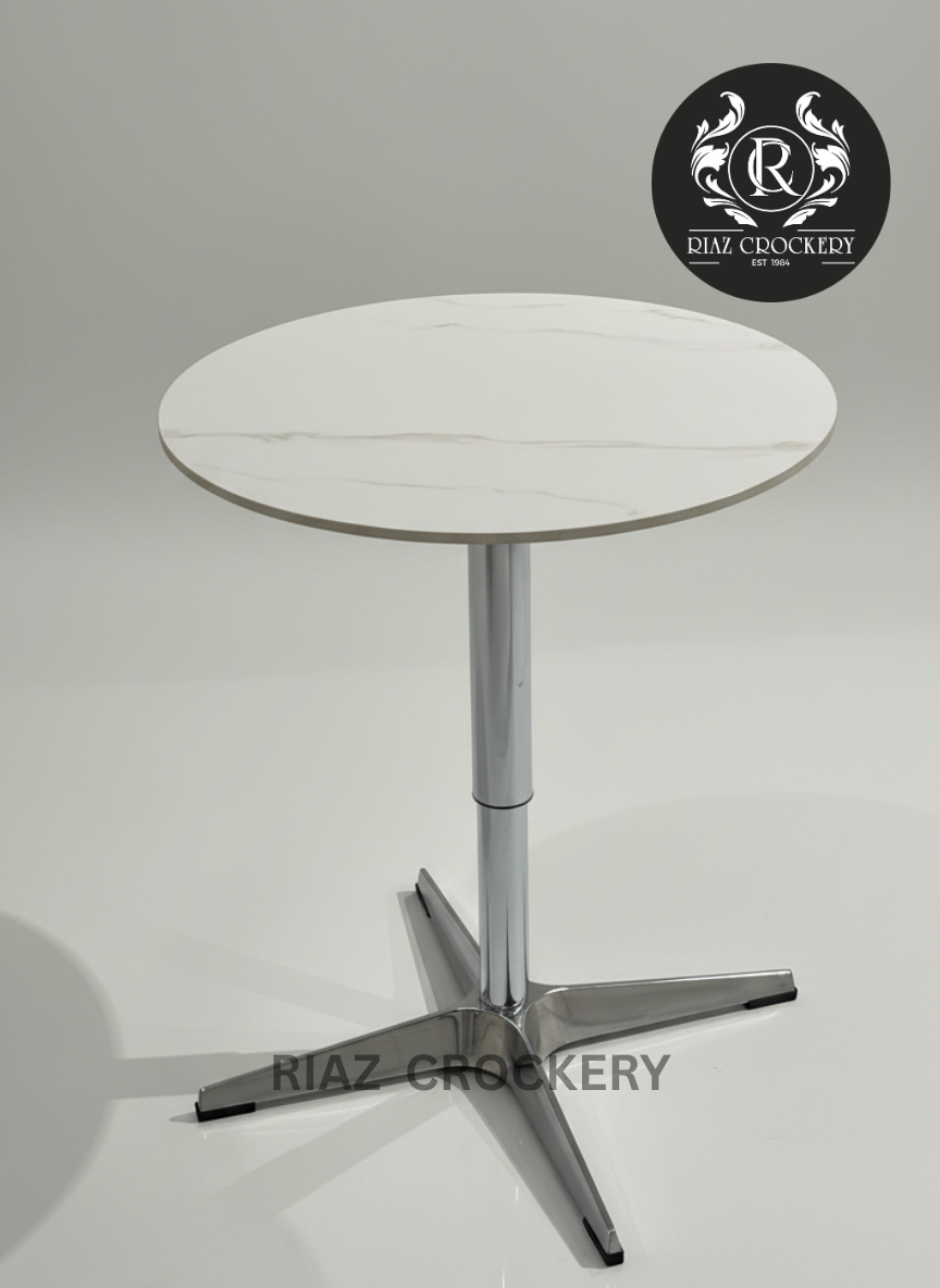 This is a really cool and smart table where the top actually moves. It has a bright white top that looks like fancy marble, and it sits on a shining silver stand. The special thing about this table is that you can easily spin the top around, which is super handy for sharing snacks or reaching things without moving the whole table. It's perfect for parties, quick meals, or just as an extra spot to put things. It looks modern and is super useful for any space.
