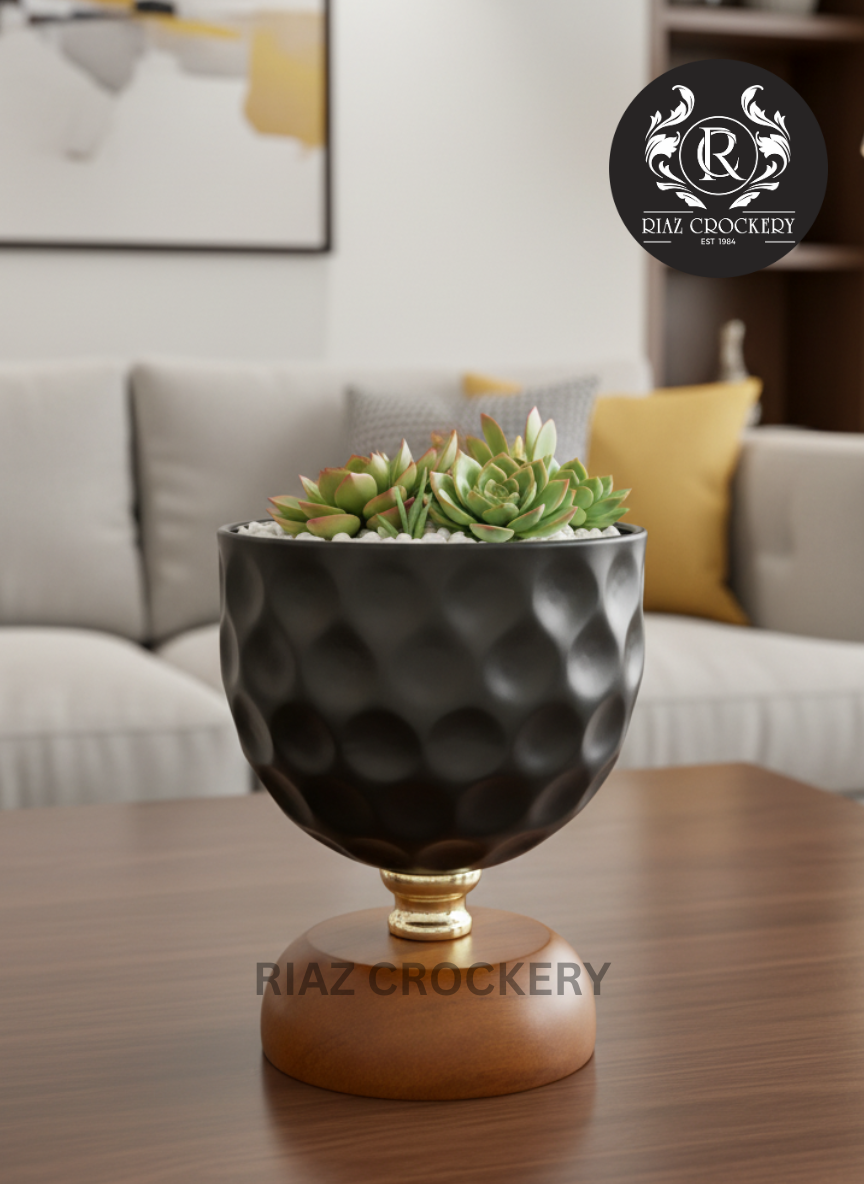 This is a really cool black metal bowl that sits on a nice wooden stand. The bowl itself is dark black and has a bumpy, dimpled texture all over, like a golf ball! The wooden base has a shiny gold ring, adding a touch of class. It's a modern and stylish way to show off small items or simply as a striking decoration.