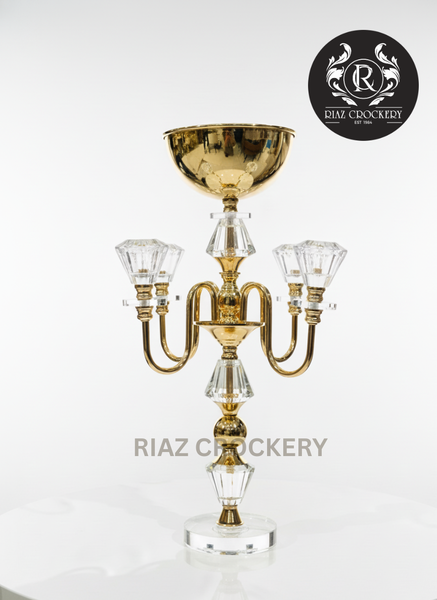 Make a dazzling statement with this magnificent Metal Brass Candle Stand! It shines with bright golden brass and is adorned with sparkling clear crystals. At the top, there's a big golden bowl, and below it, four crystal holders are ready for your candles, casting a beautiful glow. With its elegant curves and sturdy clear base, this stand is perfect for grand tables or special events, adding luxury and light.