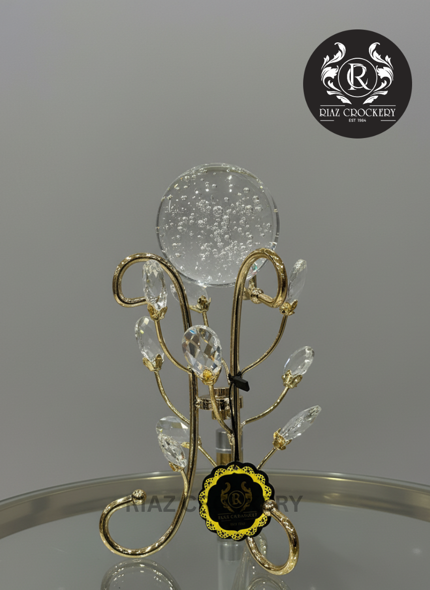 This is a very pretty golden stand with sparkly crystals and a clear bubble ball! The stand is shiny gold metal with nice curved shapes, and it has clear crystals that look like shiny leaves. On top, there's a see-through glass ball filled with tiny bubbles. It's a beautiful decoration that will make any table or shelf look extra special and bright.