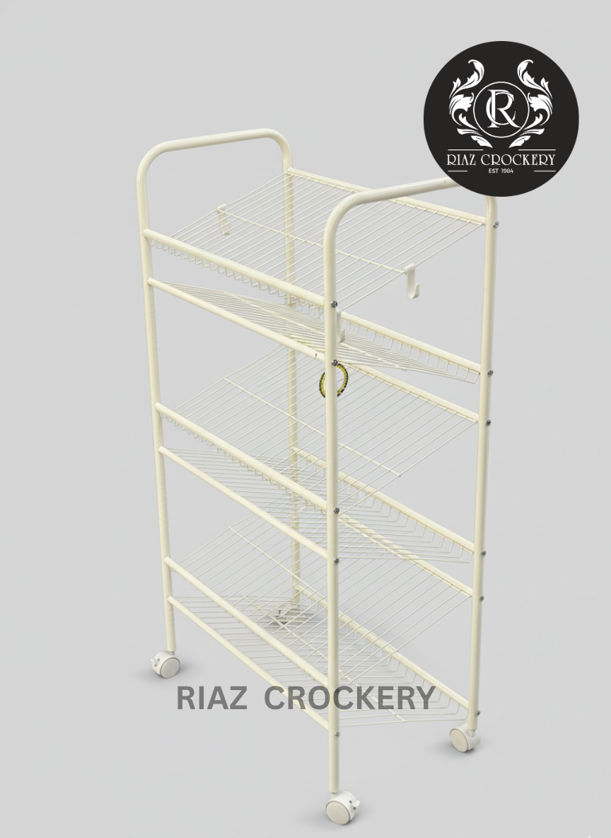 This is a very practical and tall 6-Tier Metal Shoe Rack with wheels, colored in a soft cream or off-white. It has six shelves made of wire, designed to gently slope down at the front to hold your shoes in place. With its wheels, you can easily roll it to any part of your home perfect for a large family's shoe collection in the entryway, closet, or laundry room. It's sturdy and helps keep a lot of shoes neatly organized and easy to access.