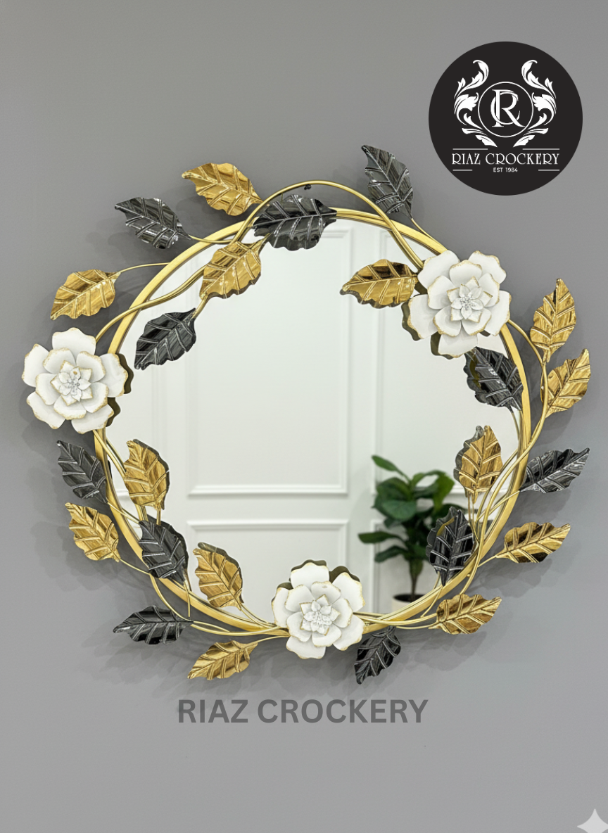 This is a very pretty metal wall mirror! It's round and has a fancy frame around it that looks like a vine wreath. The frame is gold with shiny gold leaves, dark leaves, and pretty white flowers with sparkly middles. This mirror is like a piece of art for your wall, making any room look more special and elegant.