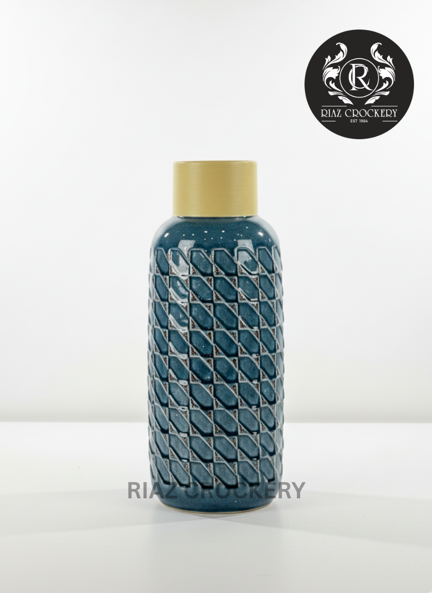 This small vase is super cute and stylish! It's a lovely deep blue with a cool, bumpy diamond pattern all around it. The little top part is a smooth, light gold color. It's just the right size for a single special flower, a few small sprigs, or to add a pretty, modern touch to any shelf or desk.