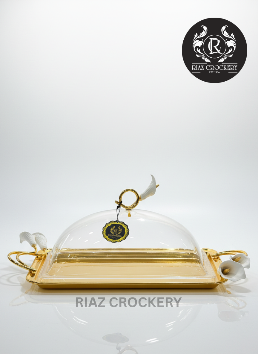 This super shiny golden platter is perfect for serving food. It has a clear acrylic lid to keep treats fresh and pretty handles with white flowers. It makes any table look fancy and special.