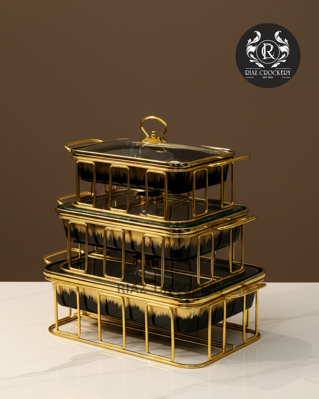 Elevate your dining experience with our elegant "More & More Square Casserole Set." This chic 3-piece serving set features three stylish black ceramic dishes, each designed with a unique brush-stroke golden pattern on the outside, creating a modern and luxurious look. Each dish comes with a clear glass lid, topped with a fancy golden ring handle, perfect for keeping your delicious food warm and fresh. These dishes stack neatly on a sturdy golden metal stand, making it easy to serve a variety of hot main courses, sides, or appetizers. It's the perfect choice for sophisticated dinner parties, elegant buffets, or any meal where you want to combine style with convenience.