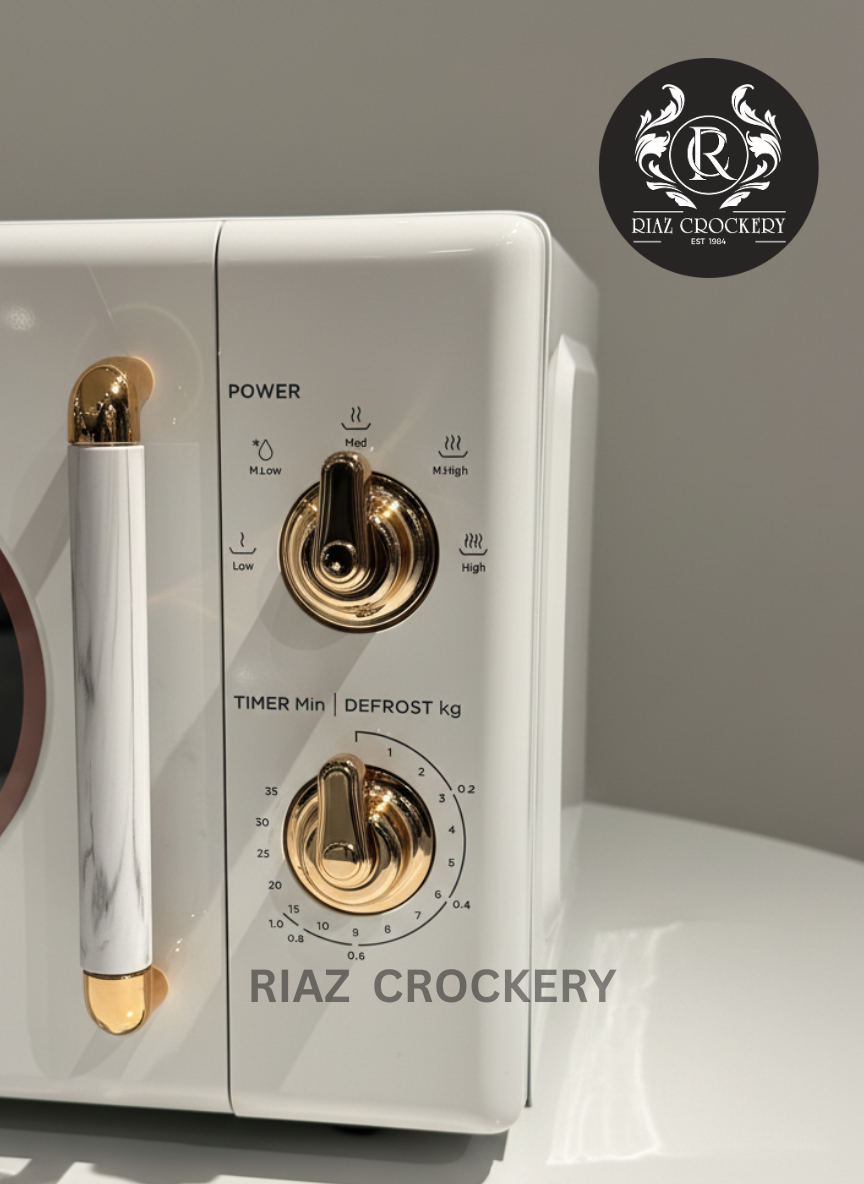 The microwave boasts a charming vintage look, with a round dark glass door framed in rose gold and a matching handle with a faux marble insert. The control panel uses two prominent gold rotary knobs. The top knob sets the power level (Low, M.Low, Med, M.High, High), while the bottom knob controls the timer (up to 35 minutes) and also includes defrost settings by weight. This microwave combines timeless aesthetics with simple, user-friendly manual controls.