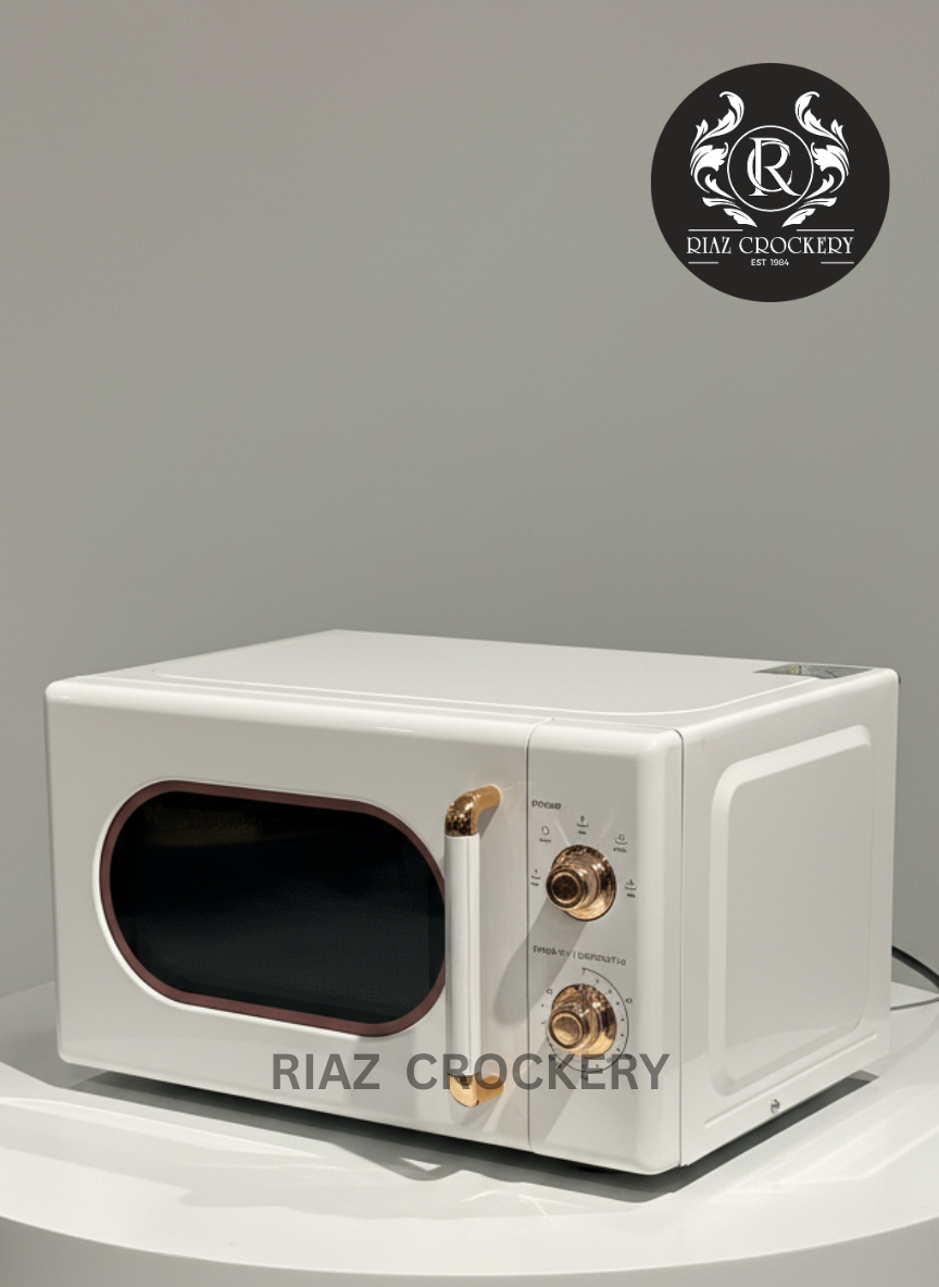 This is a stylish National microwave oven with a retro design, featuring a classic white exterior with elegant rose gold (or copper-toned) accents. It has a compact 20-liter capacity, perfect for everyday heating and small kitchens.