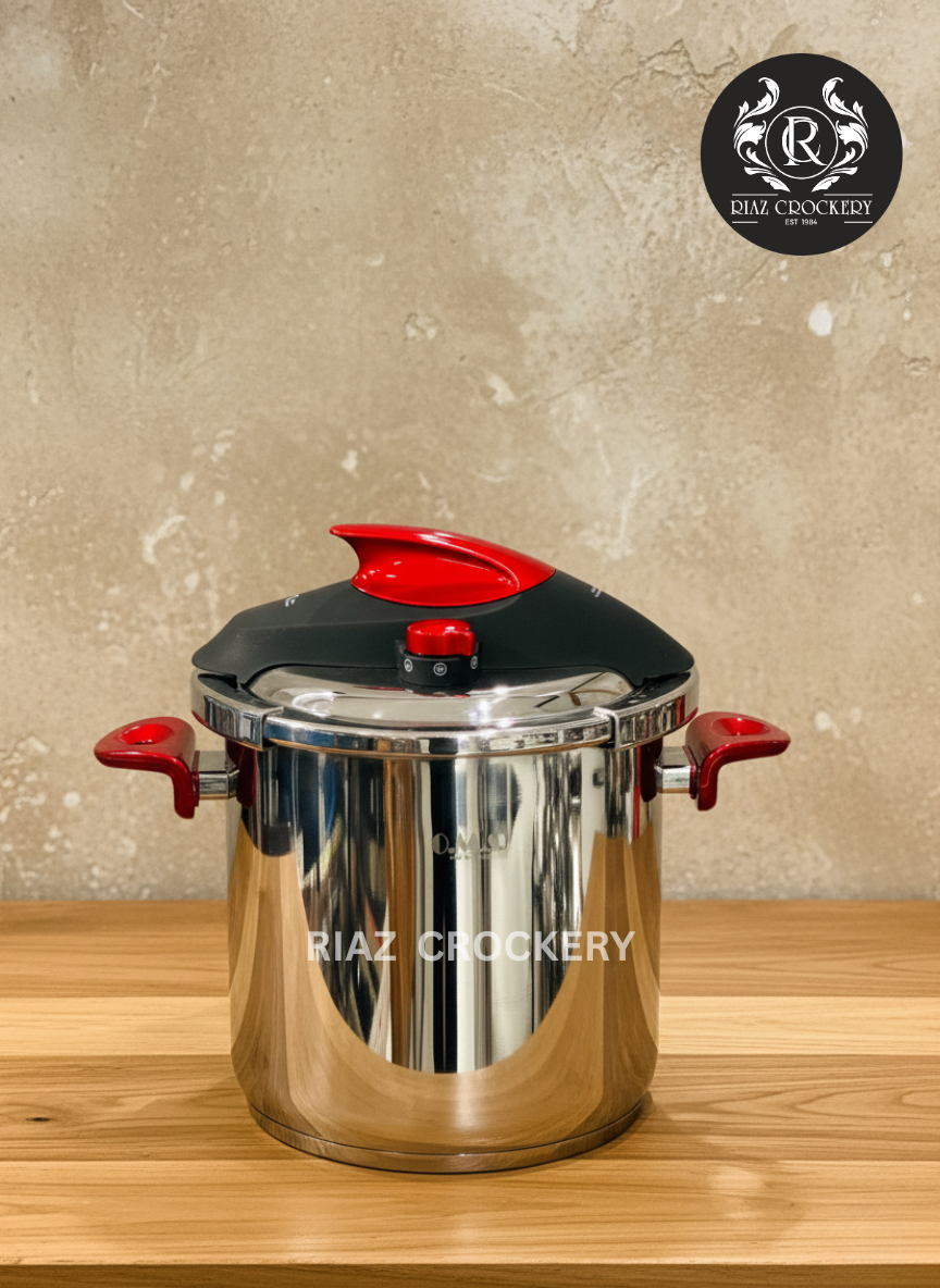 This O.M.S. Steel Cooker from Riaz Crockery is an outstanding choice for anyone seeking efficiency, robust quality, and reliable performance in their kitchen. Available in two generous sizes, 12 LTR and 14 LTR, this premium cooker is designed to handle large meals with ease, making it perfect for families, entertaining, or bulk cooking. It features a gleaming stainless steel body with striking red and black accents on the lid and handles, combining a modern aesthetic with practical functionality.
