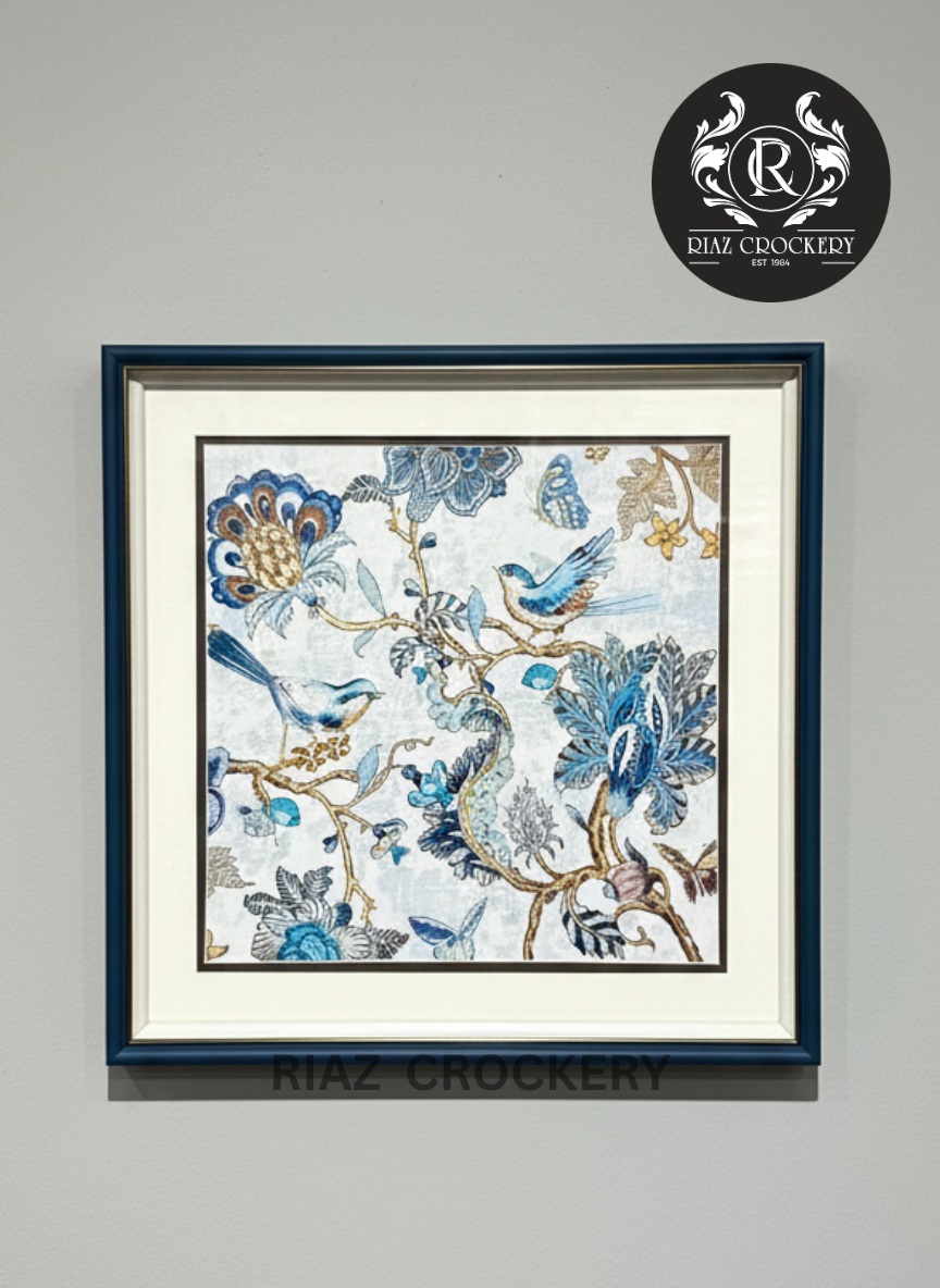 Adorn your walls with the delicate beauty of this enchanting oil painting wall frame, featuring an intricate tapestry of blue and gold botanical patterns, accented with charming birds and butterflies. The rich textures and detailed brushwork give it a luxurious, handcrafted feel, bringing a touch of classic elegance and nature-inspired artistry to any room.