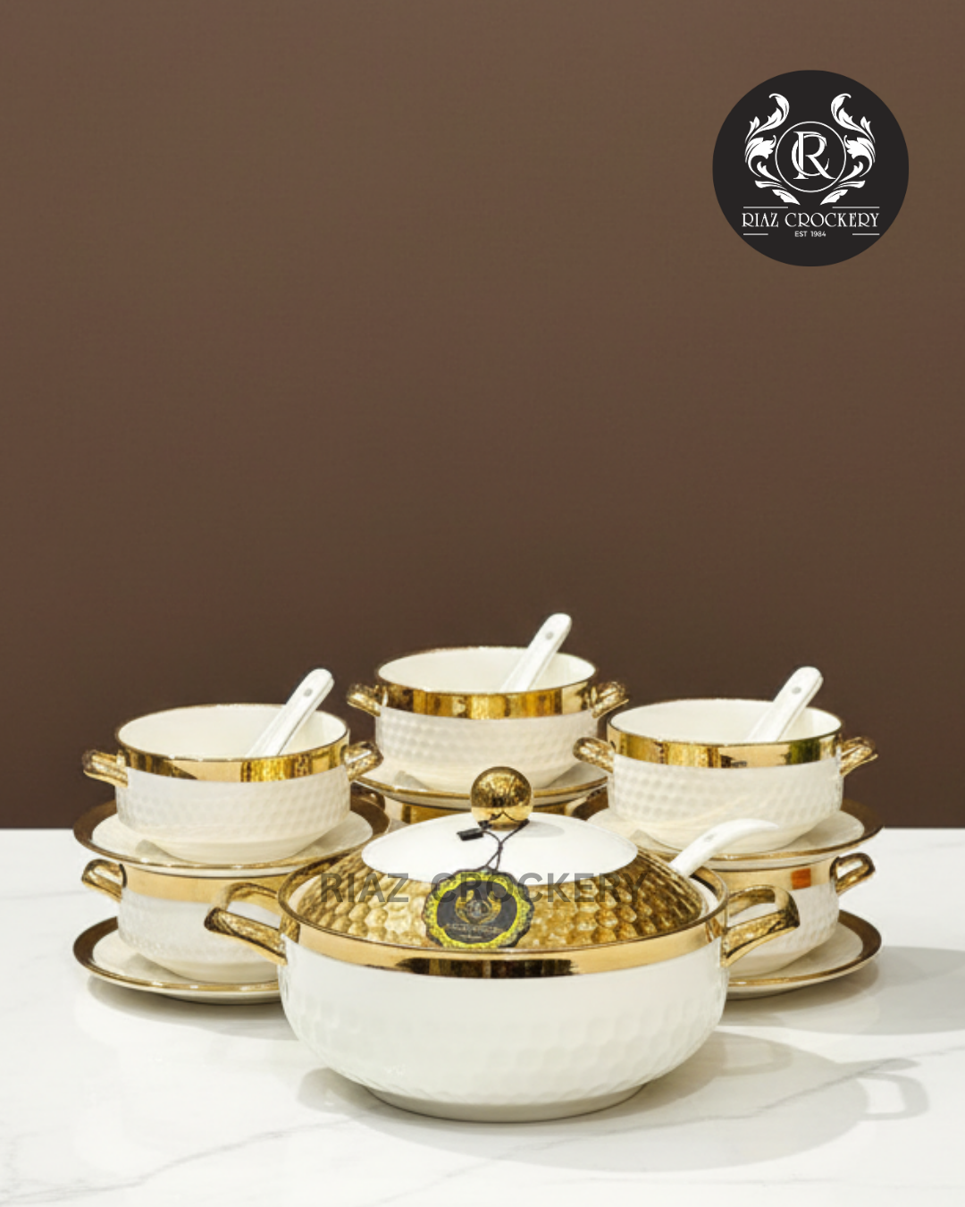 Dine in dazzling style with the JOHANSON SOUP SET. This 21-piece ceramic collection features a stunning large carry bowl with a textured gold lid and body accent, alongside six elegant small bowls with matching gold-rimmed saucers. Complete with six ceramic soup spoons and a serving spoon, this set exudes modern luxury and provides a complete, opulent service for your guests.