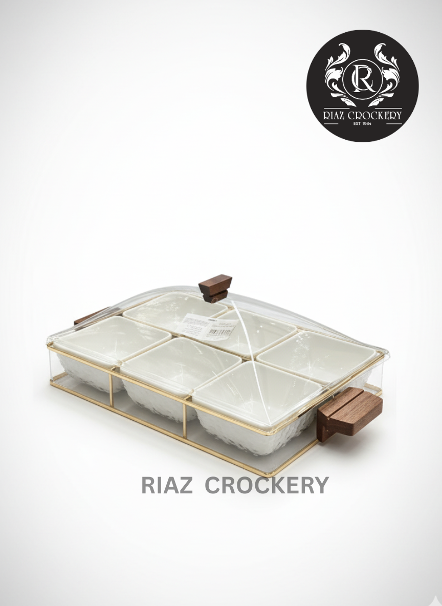 Organize and serve your favorite dry fruits and snacks with this elegant Orchid Dry Fruit Tray. It features six crisp white ceramic bowls, perfect for keeping different items separate. These bowls rest neatly within a sleek golden metal frame, which has stylish wooden handles for easy carrying. A clear lid keeps everything fresh and clean, making it ideal for entertaining or everyday use.