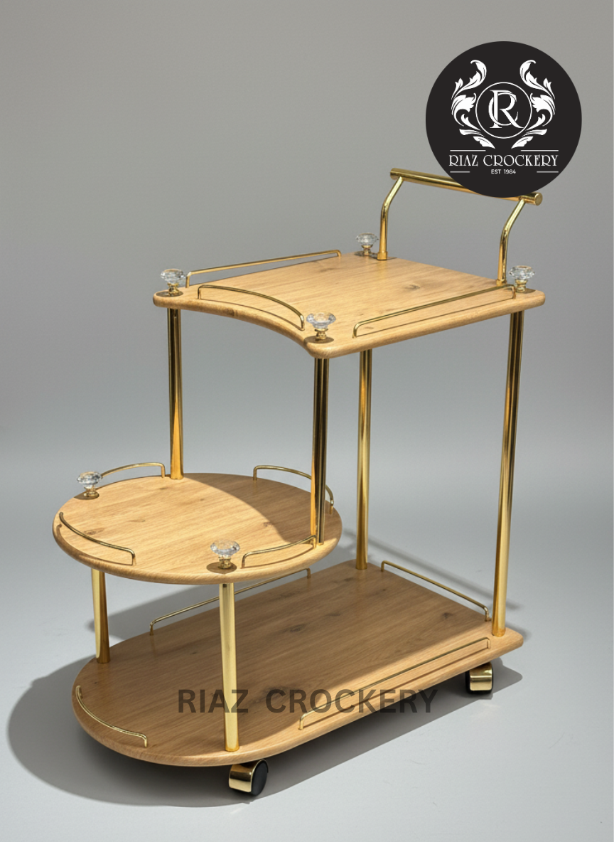 This beautiful tea trolley, named "Orchid," brings a touch of nature and fancy style to your home. It has lovely light-colored wooden shelves, with shiny golden poles and handles, and sparkling clear knobs that look like little jewels. With three different shaped shelves, there's lots of space for serving drinks, snacks, or even showing off your favorite decorations. It has wheels, so you can easily roll it to wherever the party is, It's a special piece that mixes natural wood warmth with elegant golden touches.