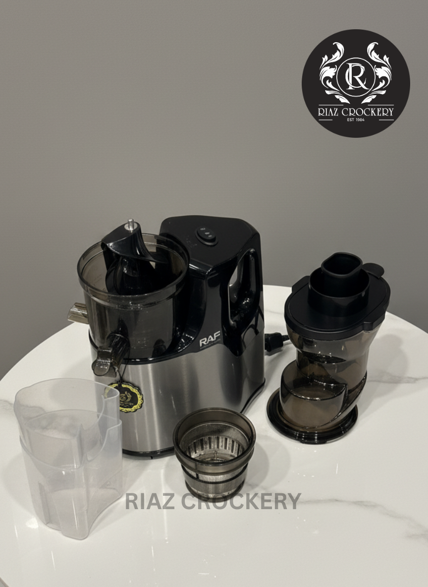 This RAF Slow Juicer makes delicious and super healthy juices from your favorite fruits and vegetables. It works slowly to get out the most vitamins and best taste. It's smart because it has two different spouts: one sends the fresh, clean juice into a cup, and the other sends the dry leftover pulp into another cup. This means you get pure juice with no mess, making healthy drinks easy every day.