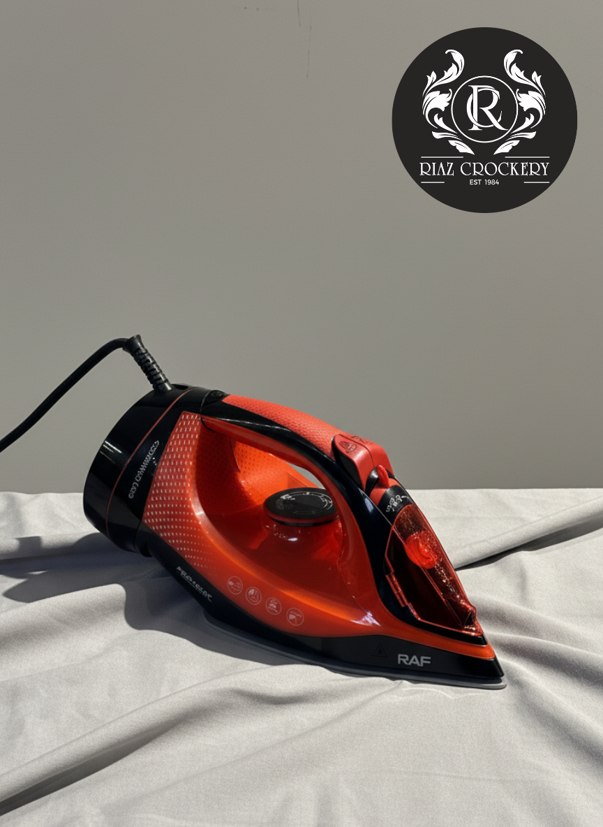 This bright red RAF Steam Iron makes getting rid of wrinkles super easy. It uses steam and heat to make your clothes smooth and fresh. The special soleplate glides easily over fabrics, and you can choose the right heat for different types of clothes. Get ready to look sharp and neat with perfectly ironed outfits.