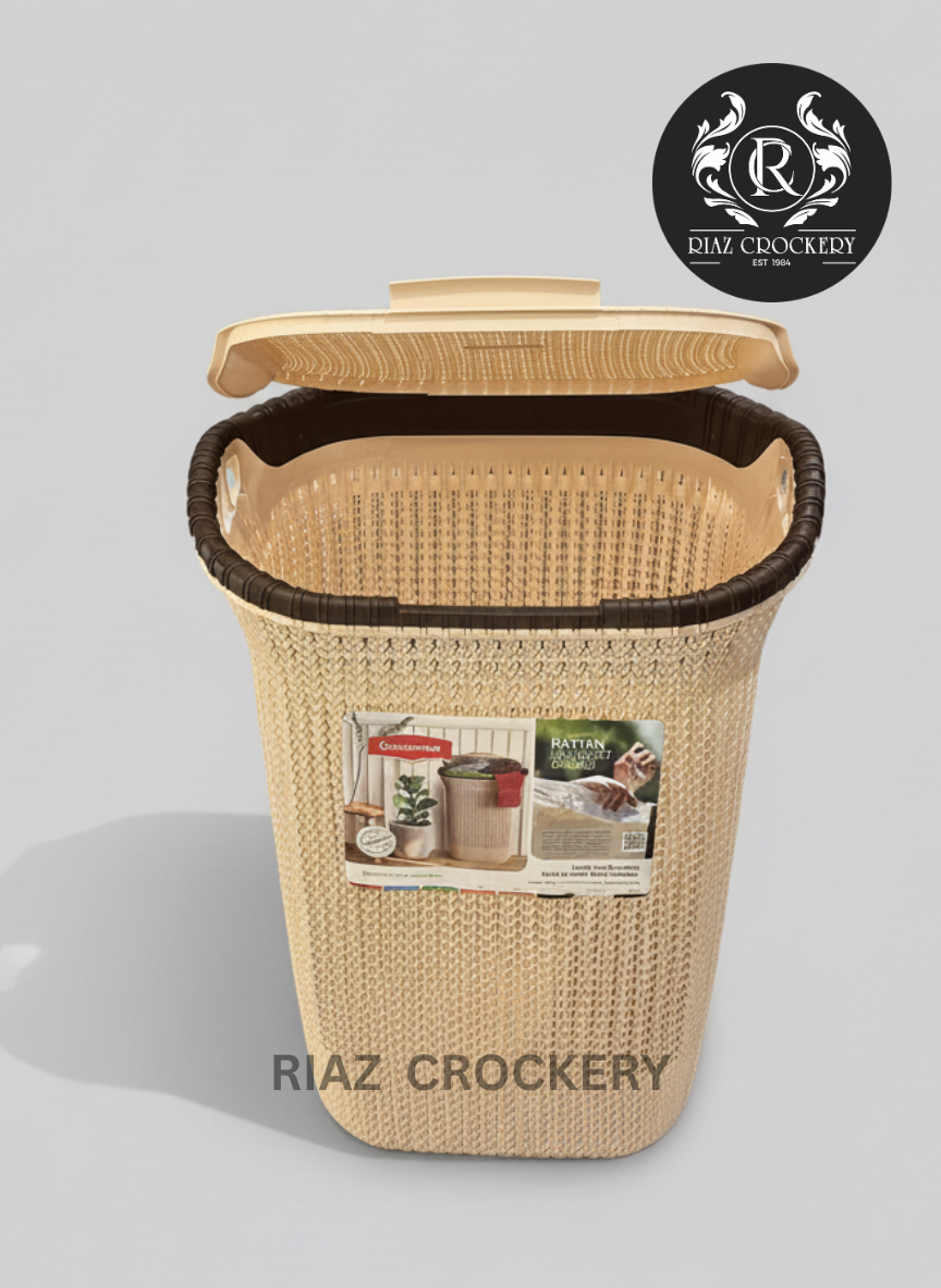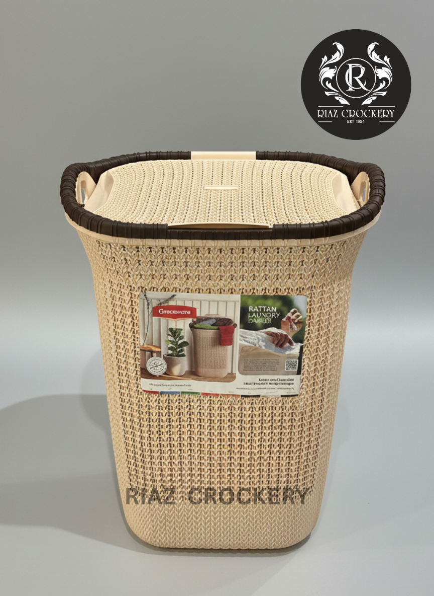 This is a simple and nice laundry basket that looks like it's made from woven rattan, but it's actually plastic. It's a great way to hold your dirty clothes until wash day. It comes in a light, natural color with a dark brown rim and has a matching lid to keep your laundry out of sight. The woven pattern lets air move through, which helps stop clothes from getting smelly. There are also handles on the sides, making it easy to carry when it's time to do laundry.