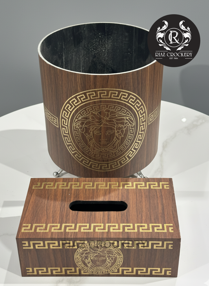 This is a stylish wooden dustbin set that adds a touch of classic luxury to your room. It has a warm brown wood look with shiny gold patterns, including a famous face design on the round trash can. The trash can also has sleek silver legs. It's a chic way to keep things tidy!