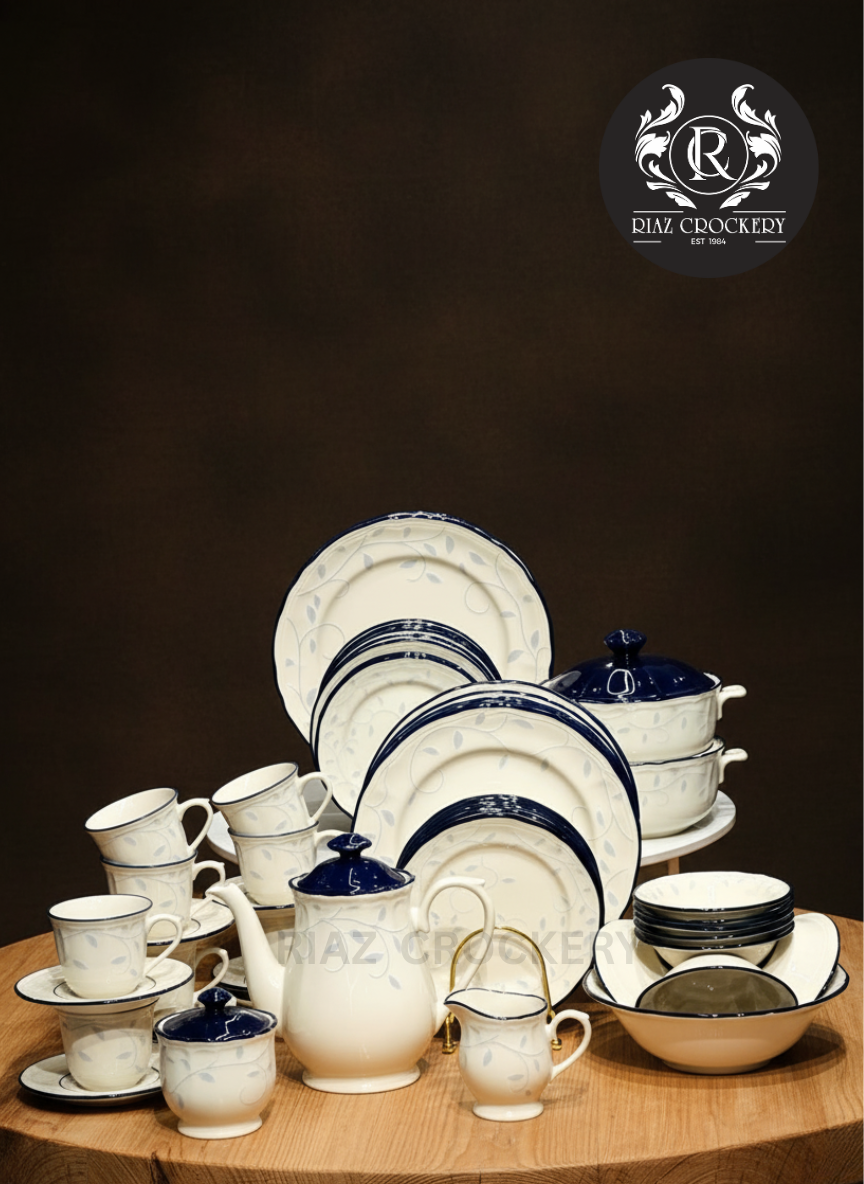 This ROYAL OF LONDON DINNER SET is a stylish 61-piece collection for 8 people. It's made from strong ceramics and has a lovely white design with blue edges and light blue leaf patterns. This set looks elegant and is great for everyday meals or when you have guests. The best part is, it's safe to use in the microwave, making it very convenient.