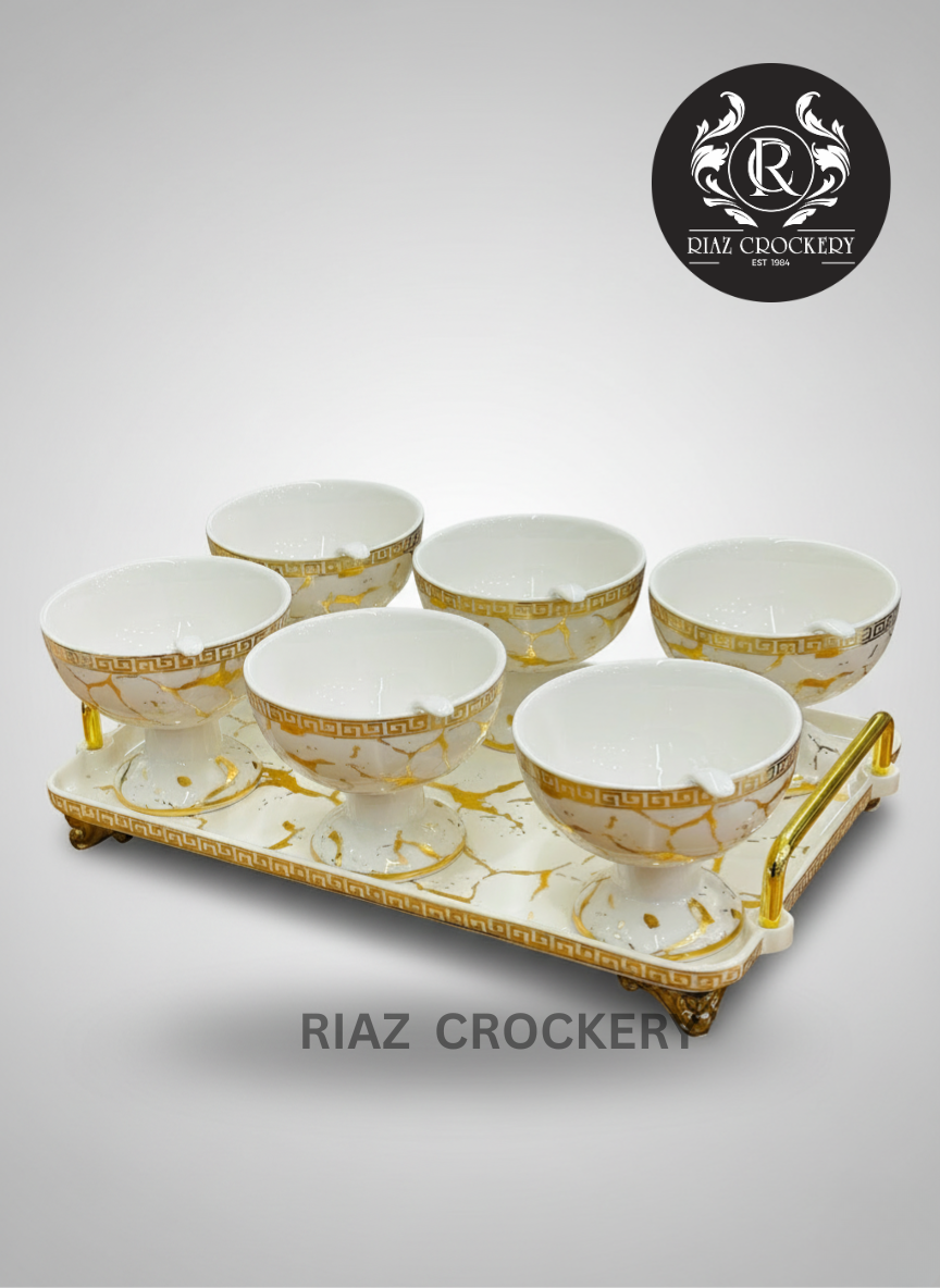 Bring sparkle to your dessert time with the Shine Sweet Life Ice Cream Set. This elegant collection features six beautifully crafted white ceramic ice cream cups, each designed with a unique golden pattern that wraps around the rim and base, giving them a luxurious feel. Six matching spoons are also included to complete your serving needs. All these pieces sit on a sophisticated white serving tray, also adorned with matching golden designs and equipped with easy-to-grip golden handles. Perfect for serving delightful ice creams, fruit cocktails, or any sweet treat, this set promises to make every dessert moment a shining occasion.