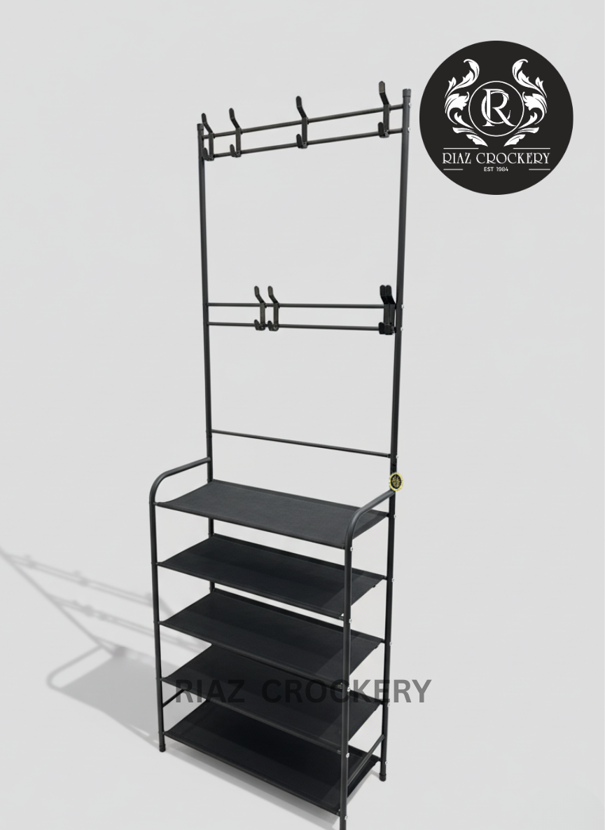 This is a very practical and simple Lifestyle Rack that helps keep your entryway or mudroom super organized. It has a sturdy black metal frame with several shelves at the bottom for your shoes. Above the shelves, there's a tall bar with multiple hooks, perfect for hanging coats, hats, bags, or scarves. It's a great all-in-one solution for keeping your everyday items tidy and easy to find when you're heading out the door.