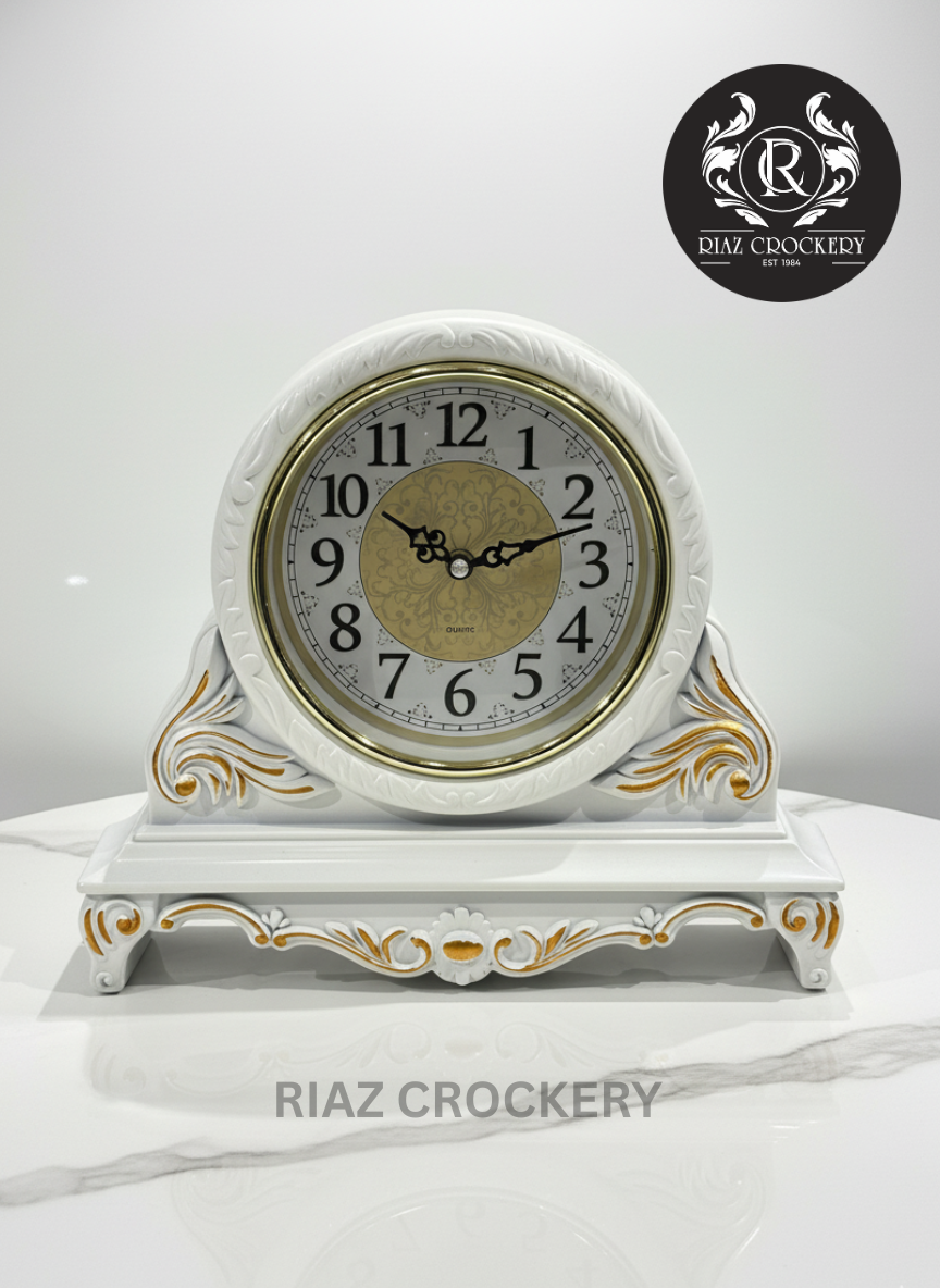 This is a very pretty table clock that looks old-fashioned and fancy! It's white with gold swirly designs on it. The clock face is round, gold inside, and has clear black numbers so you can easily see the time. This clock is great for making any room look more elegant and classic.