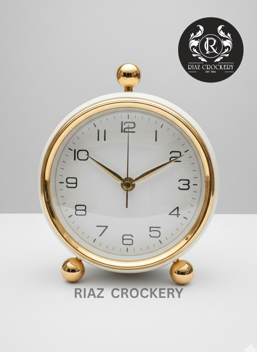 Brighten your space with this chic and lovely table clock. It features a crisp white body with beautiful, shiny golden details, making it look very clean and fancy. The bright white clock face has clear numbers that are super easy to read, and the golden frame, cute golden feet, and top knob add a touch of simple luxury. It's the perfect clock to place on your nightstand, desk, or shelf, adding bright style and making any room feel fresh and elegant.