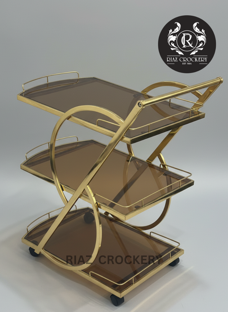 This beautiful tea trolley helps you serve things in style. It has three shelves that look like smoky brown glass, all held up by a shiny gold frame. Its pretty curved design and little wheels make it easy to move, so you can serve drinks and snacks with a fancy touch.