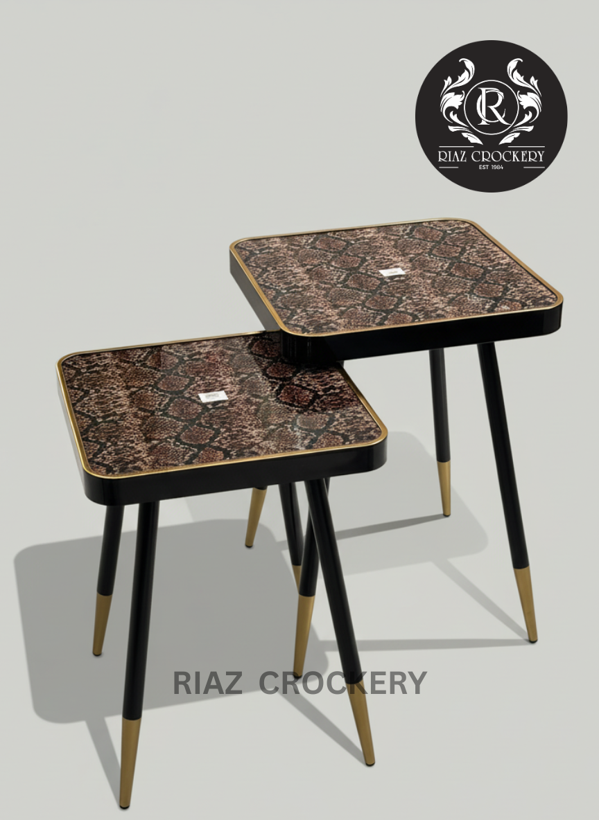 This is a stylish set of two square tables with cool snake-skin pattern tops and elegant golden edges. They stand on sleek black legs with golden tips, offering a modern, layered look or handy individual side tables. Perfect for adding unique elegance to your space.