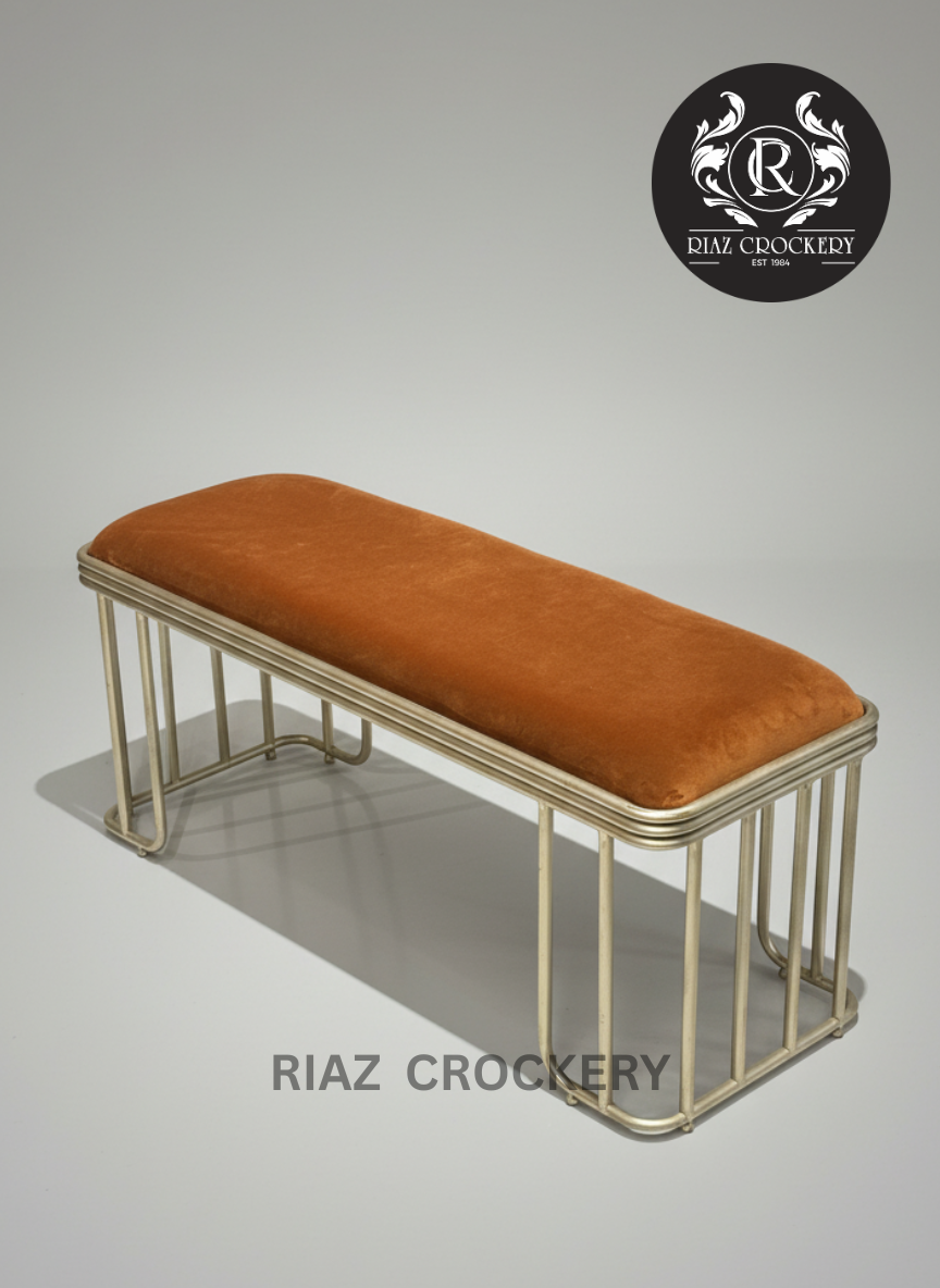 This is a beautiful and very comfy long bench, perfect for adding a touch of luxury to your home. It has a soft, plush top made from rich, warm brown velvet fabric, making it feel very soft and inviting to sit on. The bench stands on a unique frame made of sleek, light-colored metal tubes that curve at the bottom and form a neat, open design on the sides. This modern look, combined with the luxurious velvet, makes it a great piece for an entryway, at the foot of a bed, or as extra seating in your living room, bringing both style and comfort.