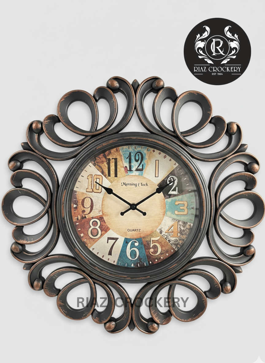 This Heritage Wall Clock is truly a statement piece, blending classic timekeeping with stunning decorative art. The intricate, dark "furniture-like" frame swirls around a captivating "Morning Clock" face, making it a focal point in any room. It's perfect for adding a touch of old-world charm and elegance to your living space.
