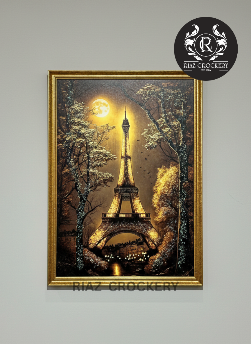 This romantic wall frame captures a magical view of the Eiffel Tower bathed in the warm glow of a full moon. Surrounded by shimmering trees and distant city lights reflected on water, the scene evokes the enchanting atmosphere of Paris at night. Framed in rich gold, this artwork is a stunning tribute to love and iconic beauty, perfect for adding a touch of romance and wanderlust to any room.