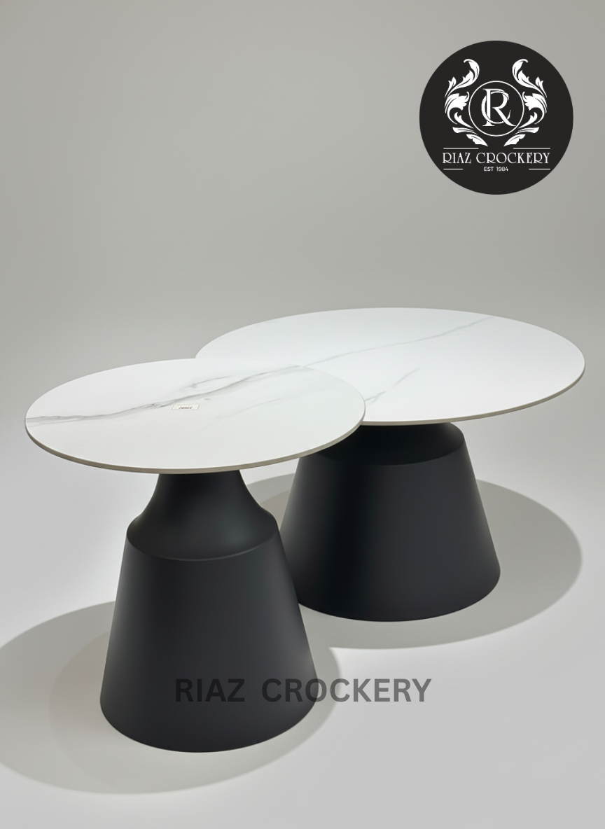 This is a really modern and elegant set of two round tables. Each table has a beautiful white top that looks just like natural marble, with subtle grey patterns. They stand on sleek, strong black cone-shaped bases, giving them a very unique and sophisticated look. The two different sizes allow you to arrange them together for a cool layered effect, or use them separately as stylish accent tables around your home. They are perfect for adding a chic and sophisticated touch to any living space.