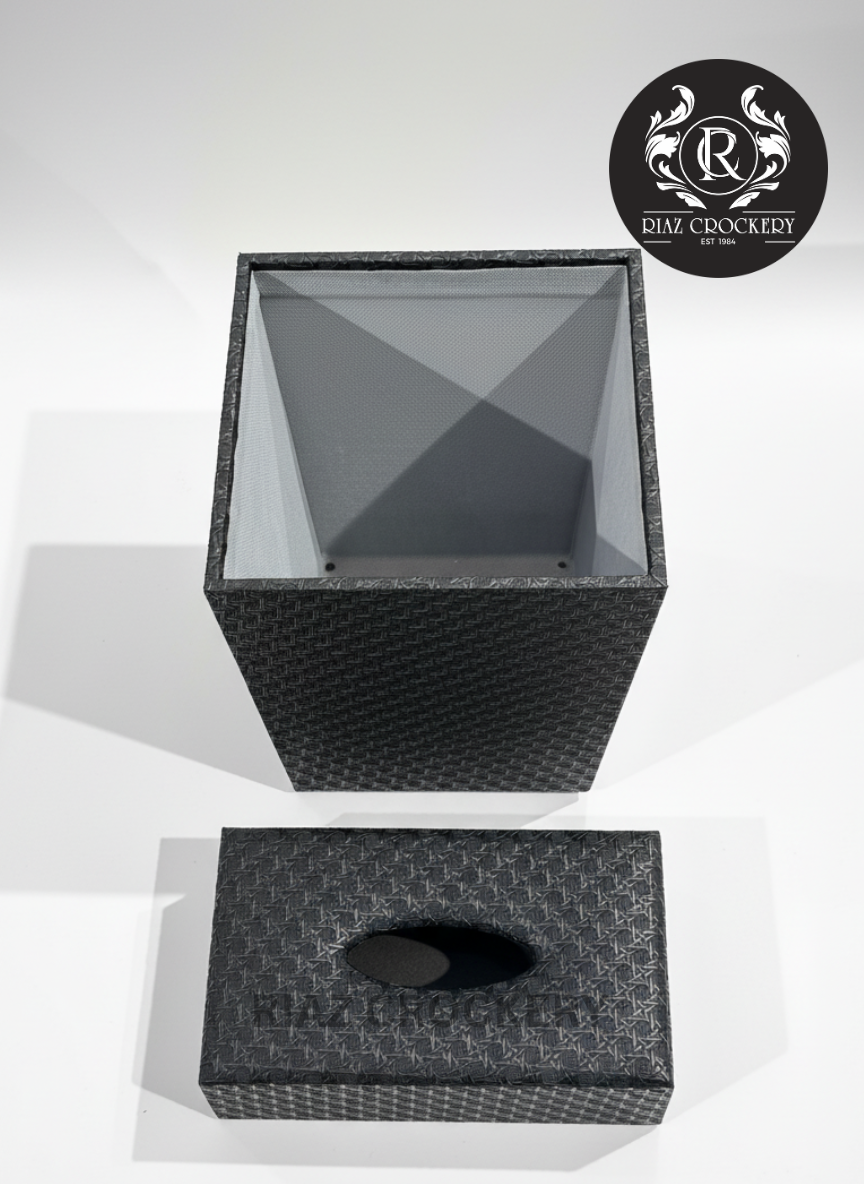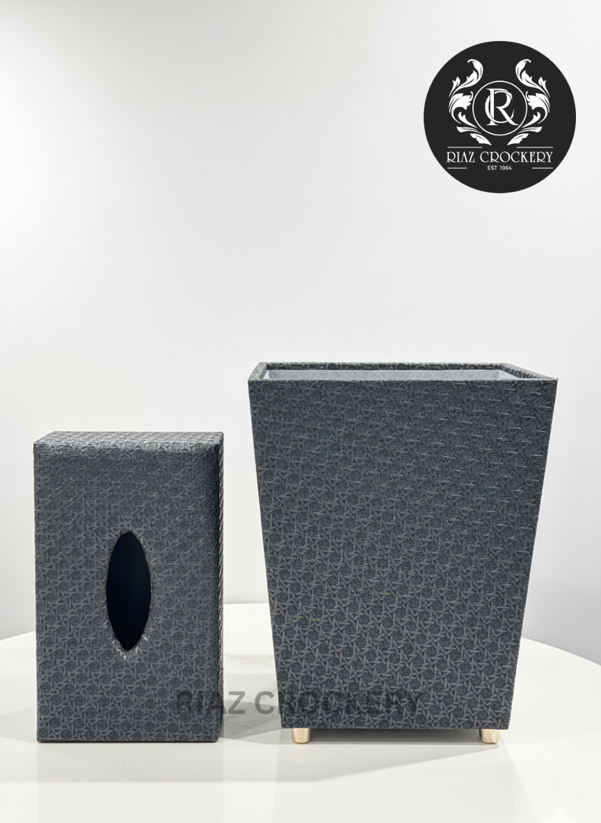This nice set has a trash can and a tissue box, both in a black color with an old-style pattern. They are made of wood. The trash can has small light feet. It's a neat and pretty set for your room.