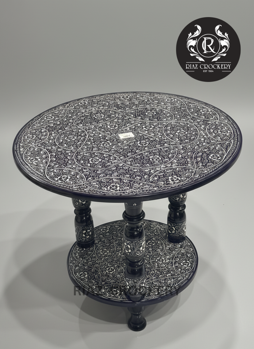 This is a really pretty and special wooden table! It's painted a dark color (like dark blue or black) and has amazing white flower patterns all over it, like tiny drawings. It has a round top and another round shelf below, perfect for putting things on. The legs are also fancy and decorated, making the whole table look very old-fashioned and expensive. It's great for making any room look grand and special, perfect for showing off pretty items.