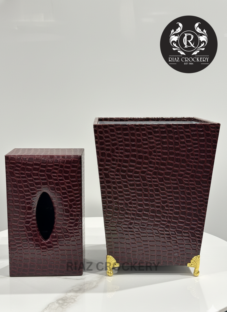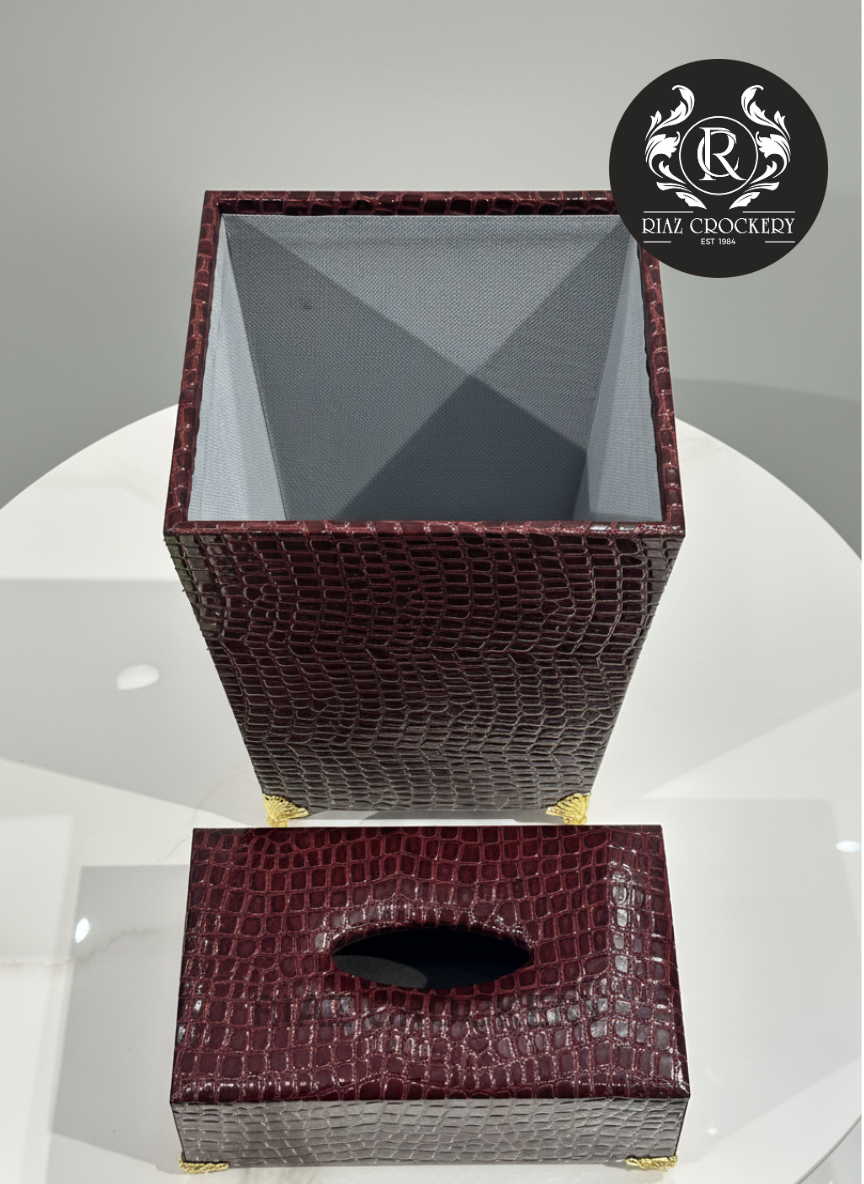 This is a stylish and practical wooden dustbin set, covered in rich, red faux leather with a crocodile texture. It includes a tissue box and a waste bin, both designed to add a touch of luxury to your room. The waste bin even has fancy golden feet for extra charm!