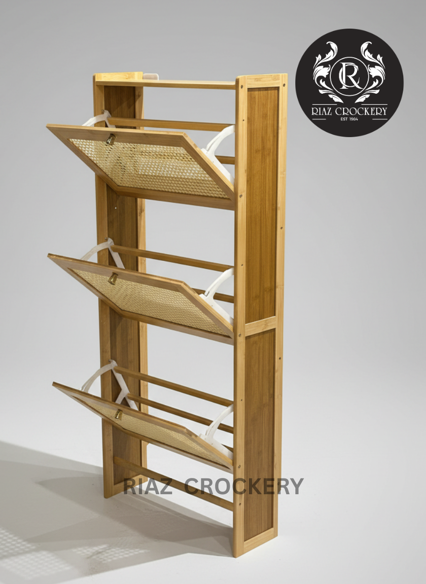 This is a beautiful and elegant Medium Wooden Shoes Cabinet that's perfect for keeping your shoes neatly hidden away. It's made from warm-toned wood and features three pull-down doors. Each door has a lovely woven rattan-style front, which helps air flow through and gives it a very classic, natural look. Inside each door, there are shelves where you can store your shoes, keeping your entryway or room tidy and looking great. It's a stylish way to organize your footwear with a balanced height.