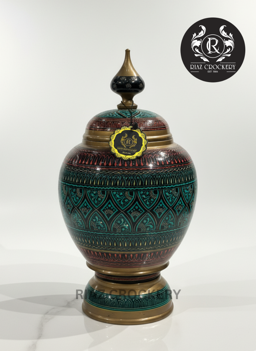 This beautiful wooden candy jar is perfect for your best sweets! It's made of wood and has amazing hand-painted designs in pretty colors like green, red, and gold. The tall lid makes it look very fancy. Use it to hold treats or just as a lovely decoration. It's a truly special piece for your home.