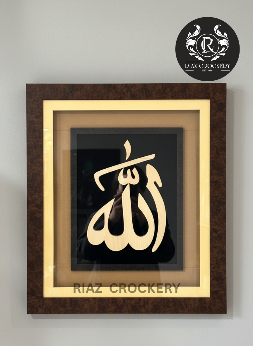 Bold "Allah" Calligraphy: The central word stands out clearly in a light wood tone.